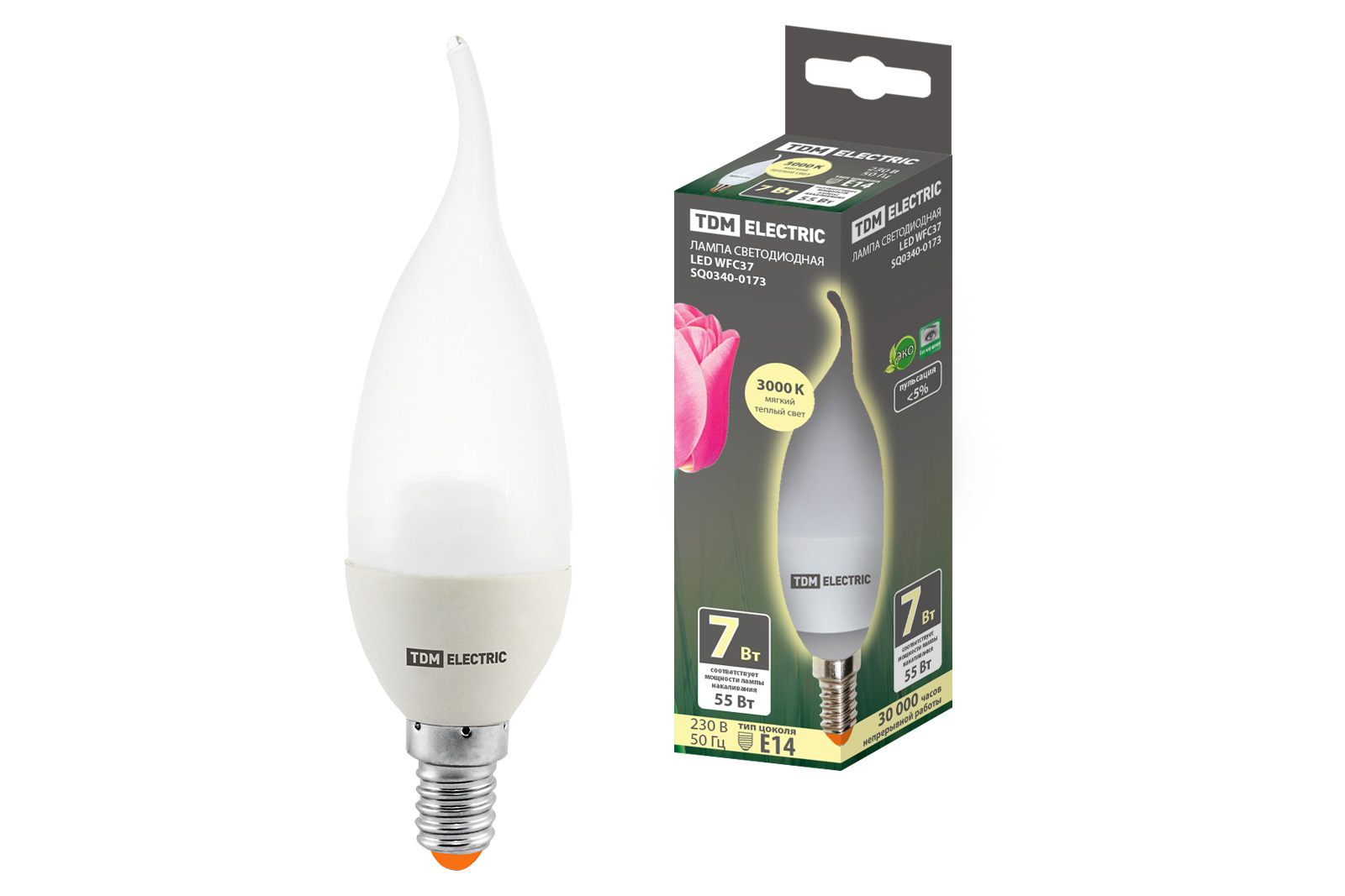 Лампа диодная свеча на ветру 7Вт Е14 3000К 510Лм TDM (10/100)