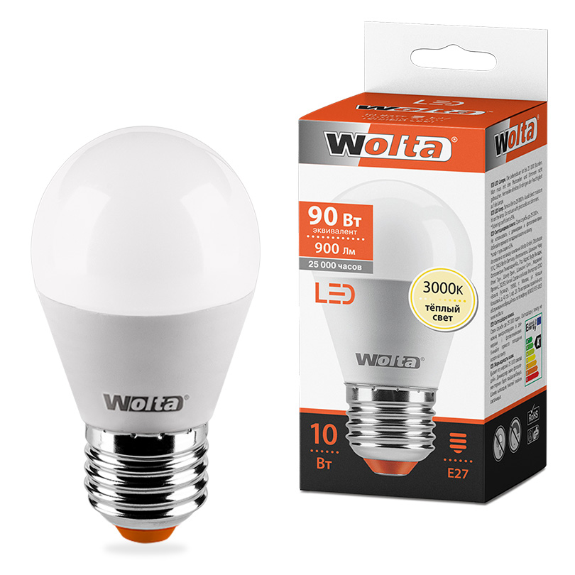 Лампа диодная шар G45 10Вт Е27 3000К 900Лм Wolta (50)