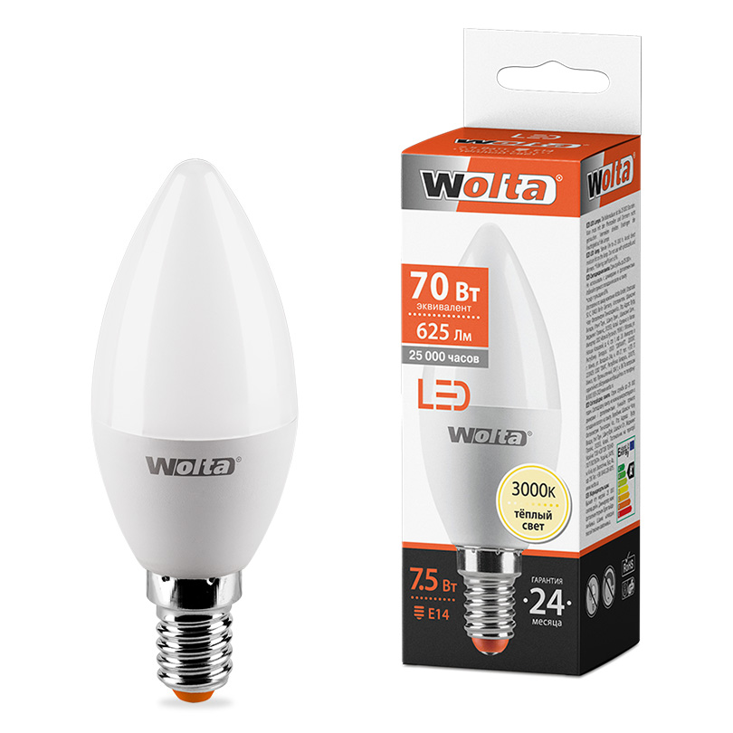Лампа диодная свеча 7.5Вт Е14 3000К 625Лм Wolta (50)**