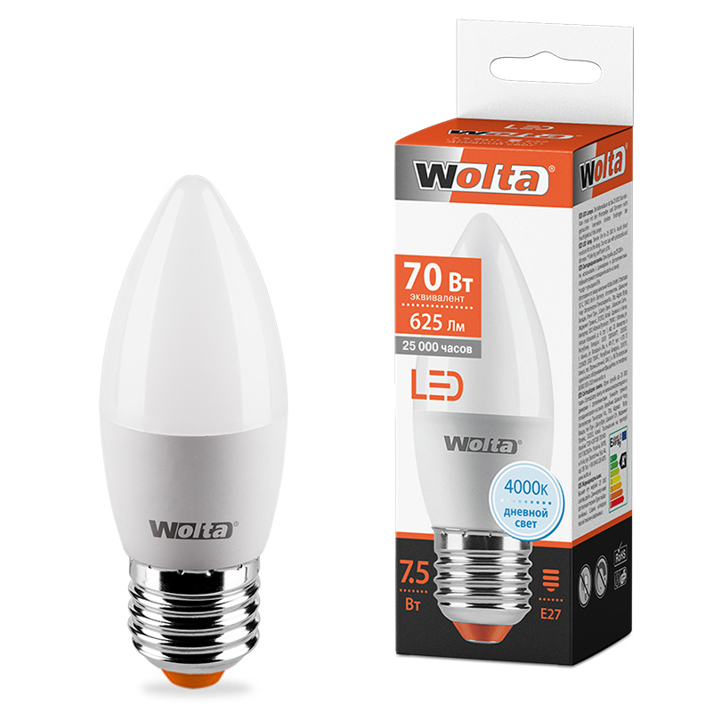 Лампа диодная свеча 7.5Вт Е27 4000К 625Лм Wolta (50) #