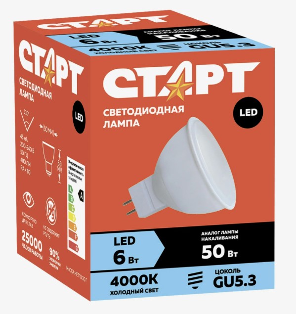 Лампа диодная MR16 GU5.3 6Вт 4000К 480Лм Старт (10/100)