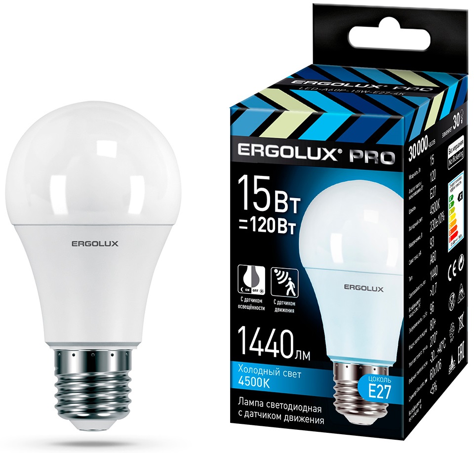 Лампа диодная A60 15Вт Е27 4500К 1440Лм Ergolux датчик движения (10/100)