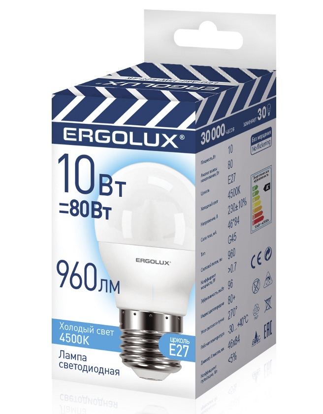 Лампа диодная шар G45 10Вт Е27 4500К 960Лм Ergolux (10/100)