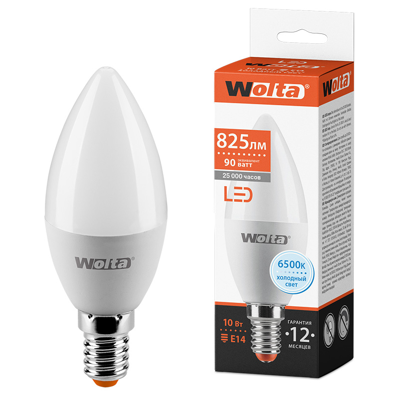 Лампа диодная C37 10Вт 900лм Е14 6500К Wolta (50)