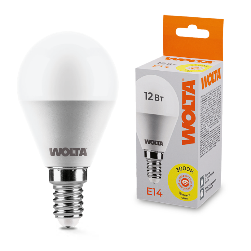 Лампа диодная шар G45 12Вт Е14 3000К 1050Лм Wolta (50)