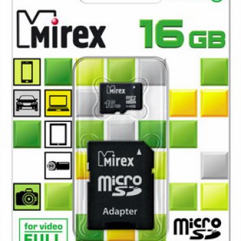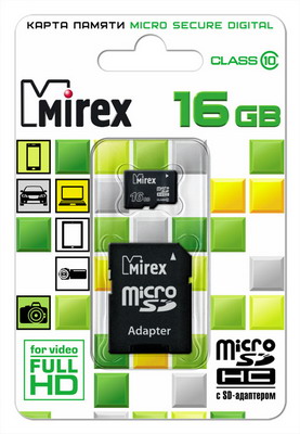 Карта micro-SD Mirex 16GB Class 10 + адаптер (SDHC)