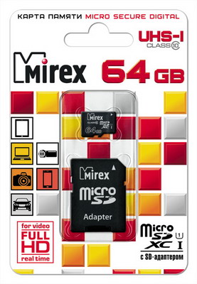 Карта micro-SD Mirex 64GB Class 10 + адаптер (SDXC) UHS-I
