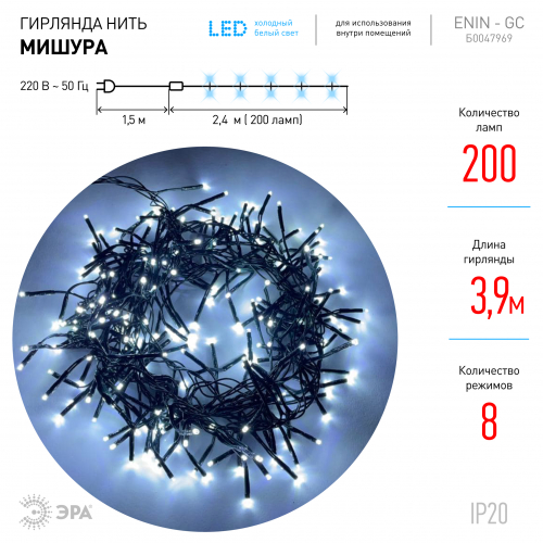 Нить ENIN-GC Мишура 3.9м зеленый провод холодный свет 8режимов 220V IP20 Эра