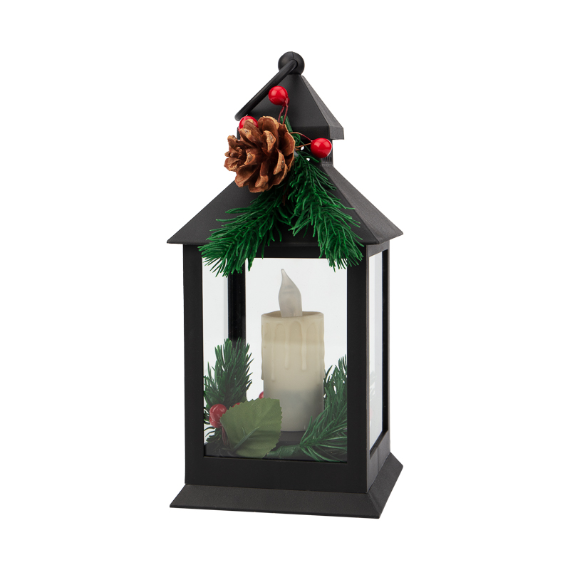 Декоративный фонарь со свечкой и шишкой 3000К 10.7х10.7х23.5см 3хААА черный (1/12)