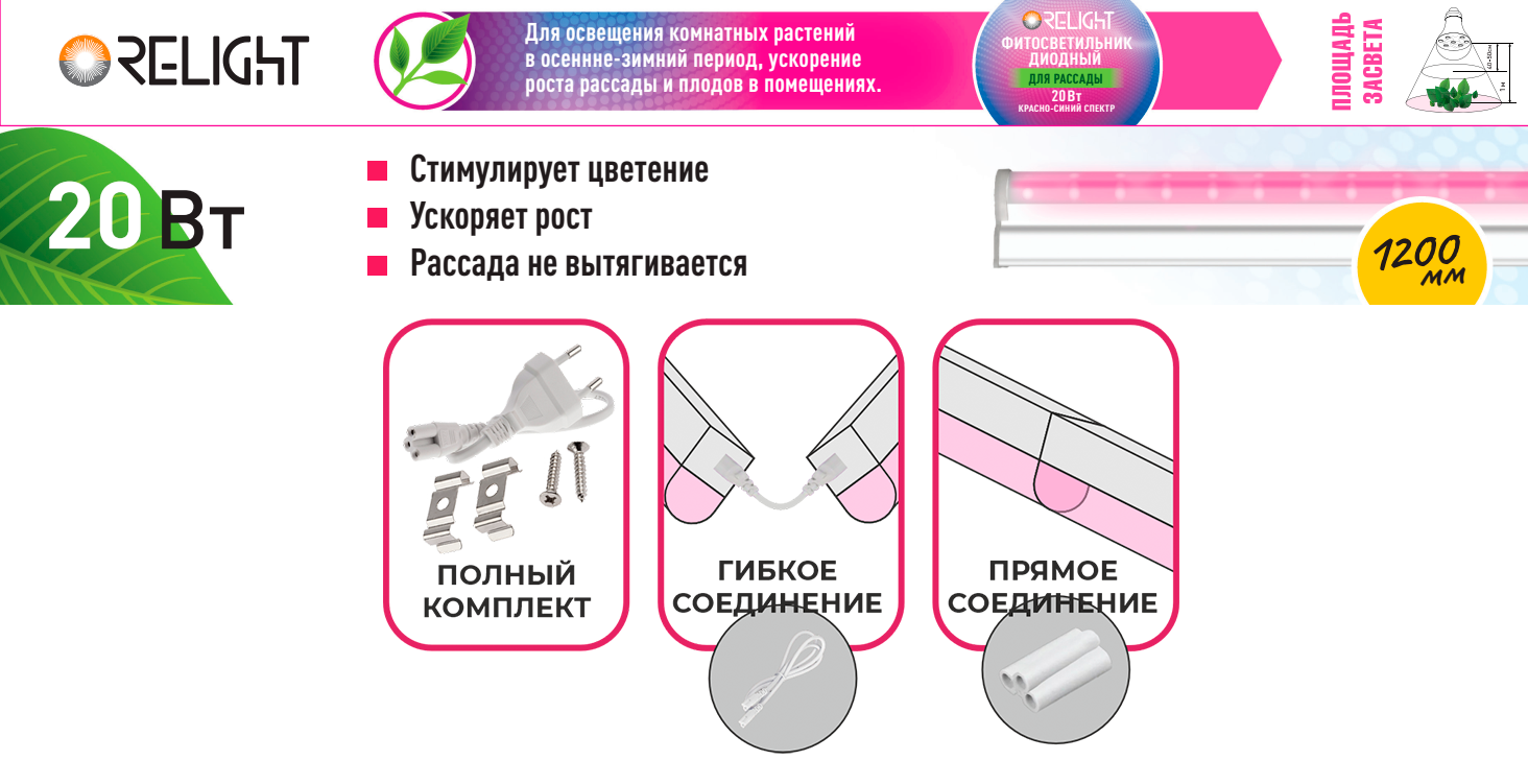 Фитосветильник линейный 20Вт Т5 1200х22х34мм IP20 красно-синий спектр коннектор без выключателя Relight (25)