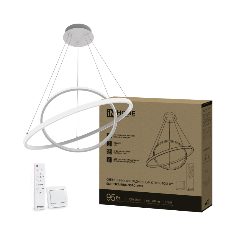 Светильник диодный InHome ESTETIKA 95Вт RING-95RC-2WH 3000-6500K 5700Лм 600x400x200мм подвес 1.2м пульт белый