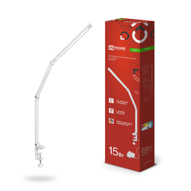Светильник настольный диодный струбцина InHome PLUS ССC-02Б 15Вт 3000-6500К 600Лм диммер адаптер белый