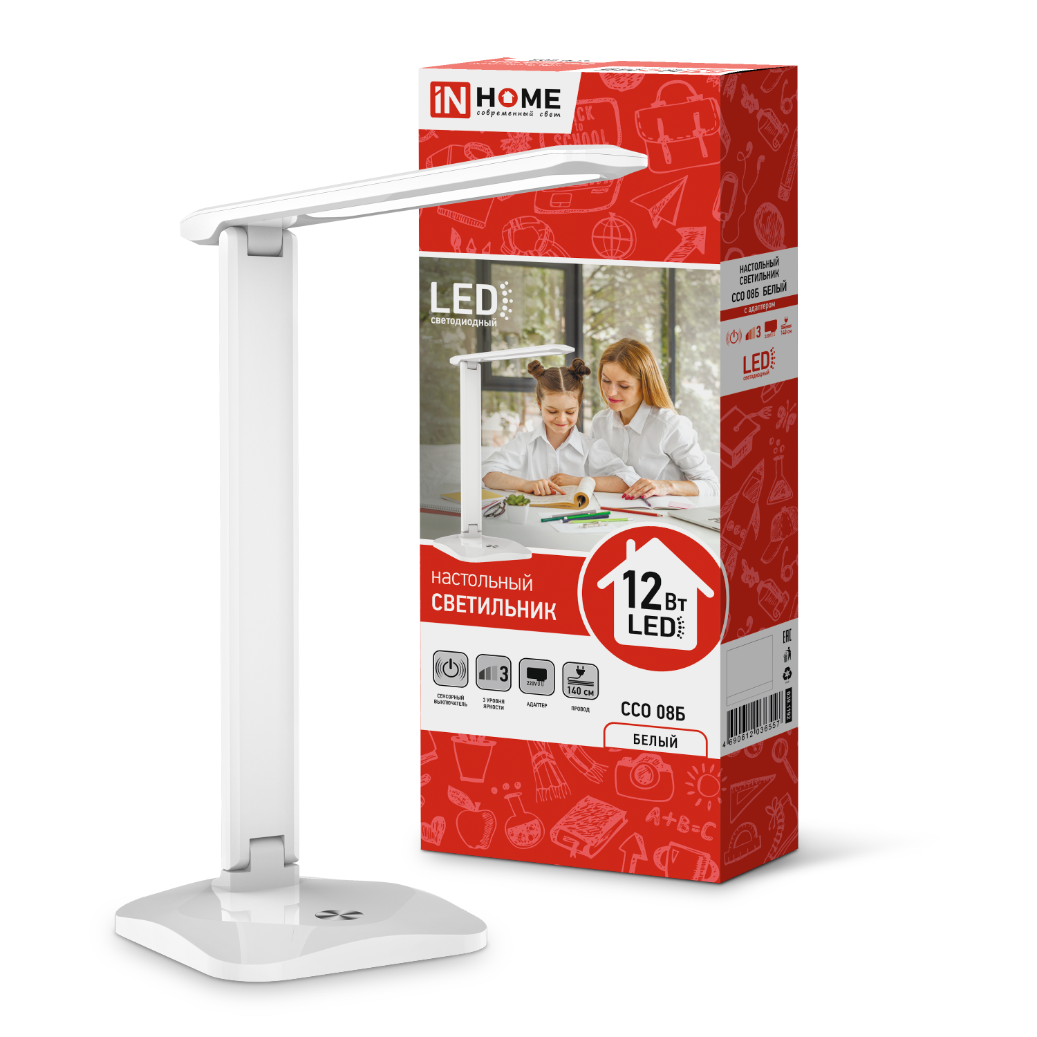 Светильник настольный светодиодный ССО 08Б 12Вт 600Лм сенсор 3 уровня яркости, с адаптером БЕЛЫЙ IN