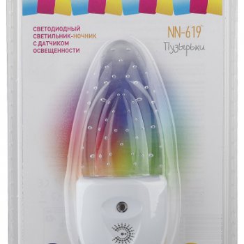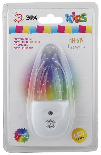 Ночник ЭРА NN-619-LS-W "Пузырьки" со светодиодами (LED) в качестве источников света и встроенным датчиком освещенности. Включается автоматически, если вокруг темно, и так же сам гаснет с рассветом. Плавные переходы цветов очень красиво "играют" приятным неярким светом. Среди множества вариантов ночников миниатюрные модели, вставляющиеся в розетку - одни из самых удобных. Светодиодные ночники ЭРА успешно выполняют свою основную функцию - создают мягкий рассеянный свет. Они отличаются мизерным энергопотреблением, которое будет незаметно в общем счете за электроэнергию. При необходимости можно смело оставлять их включенными ночи напролет. Современная LED технология исключает пульсации света. Упаковка позволяет проверить работу ночника, не доставая его из блистера, нужно только включить его в розетку и прикрыть датчик освещенности рукой.