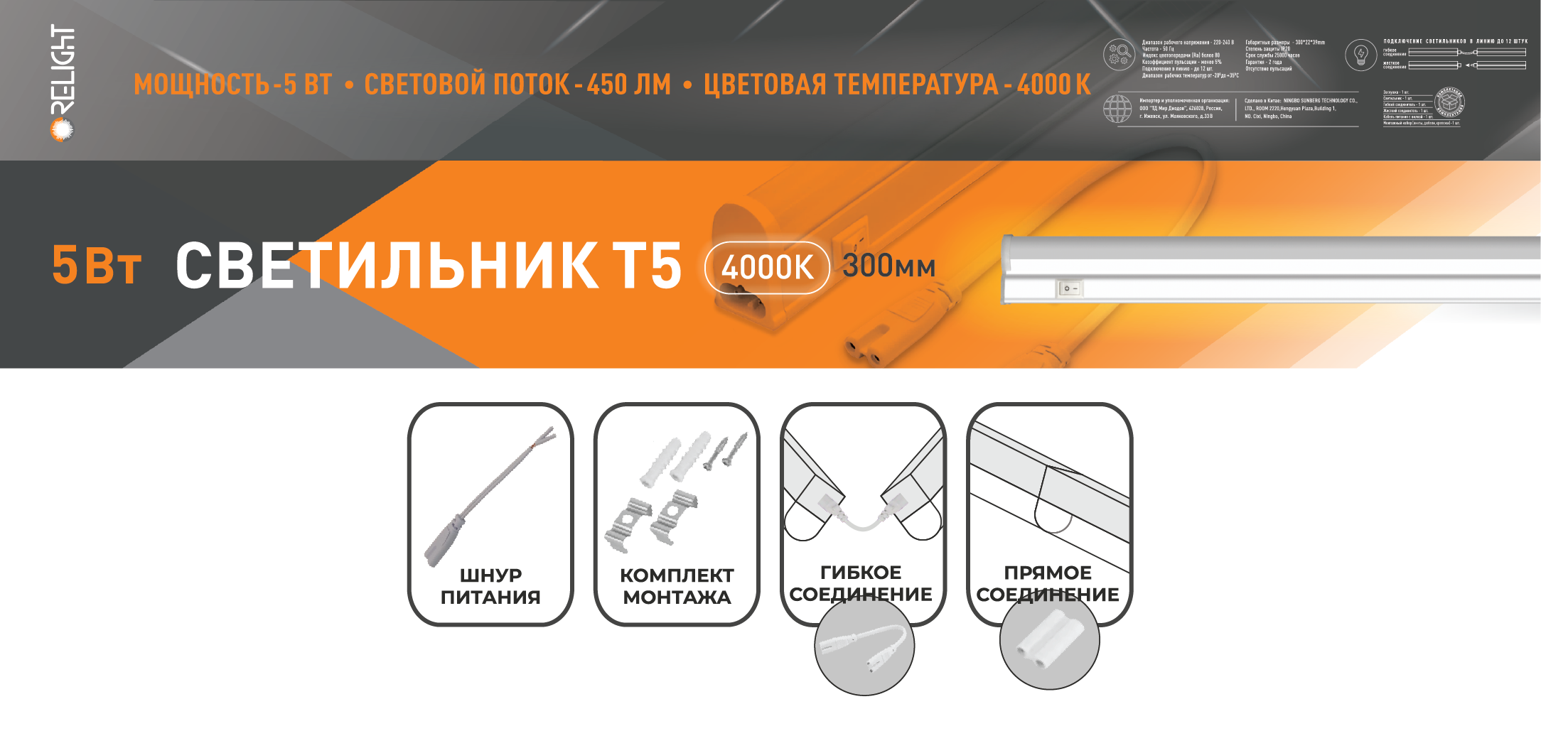 Светильник линейный Т5 5Вт 4000К 300мм IP20 450Лм Relight (25)