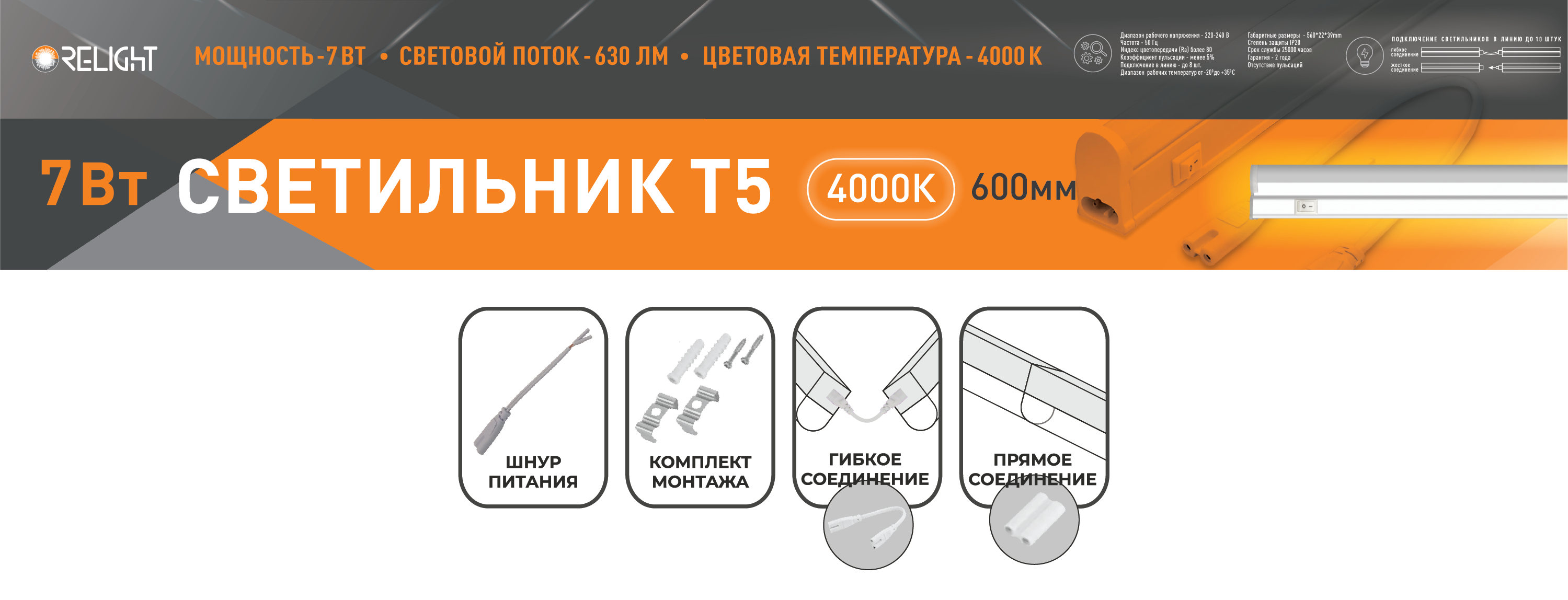 Светильник линейный Т5 7Вт 4000К 600мм IP20 630Лм Relight (25)