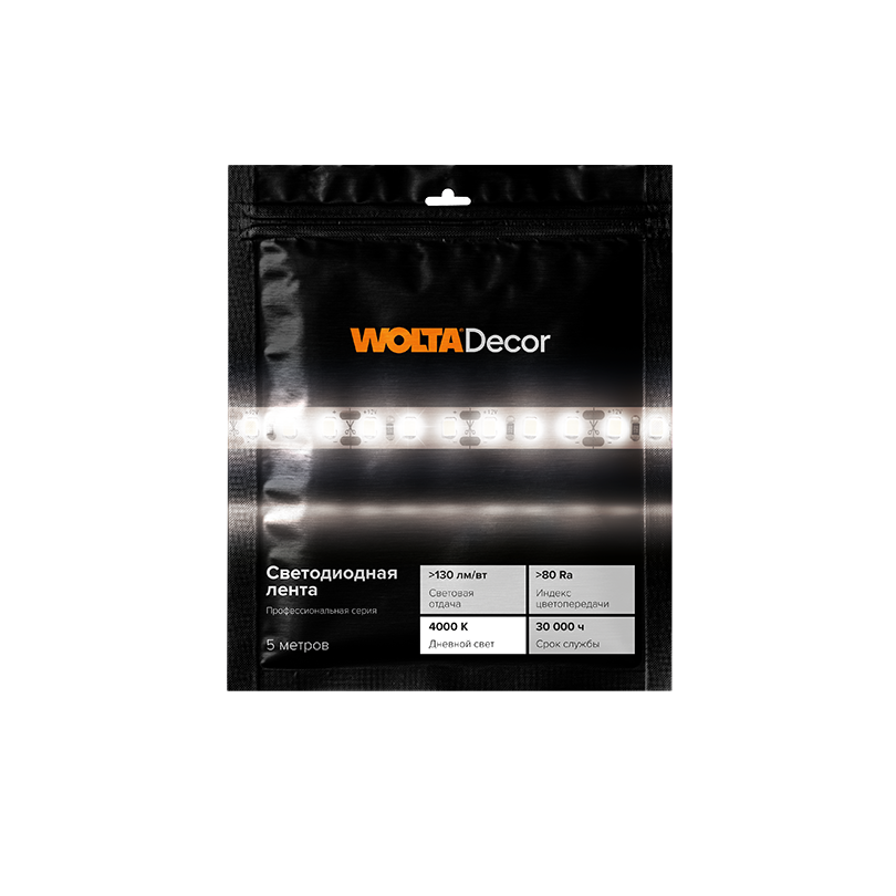 Светодиодная лента 12В IP20 24Вт/м 4000К 240диод/м 5м 10мм Wolta (1)