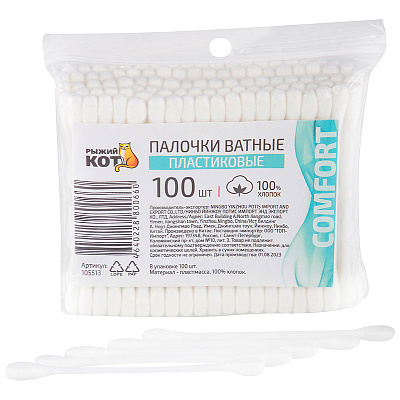 Ватные палочки РыжийКот 100шт пластик пакет (240)