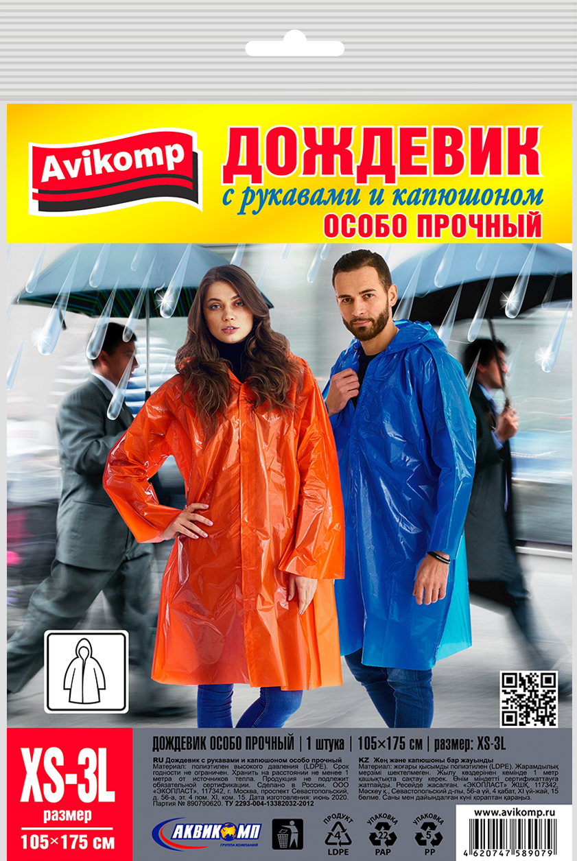 Дождевик-плащ ПВД особопрочный XS-3L 105х175см 40мкм Avikomp (20)
