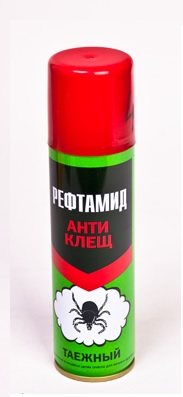 Рефтамид УСИЛЕННЫЙ Антиклещ — инсектоакарицидное средство для защиты людей от таёжных и лесных клещей, блох (переносчиков возбудителей опасных заболеваний человека: клещевой энцефалит, боррелиоз, чума и др.). В состав средства введено новое активнодействующее вещество, которое значительно повышает эффективность защиты от клещей в сравнении с традиционными средствами. Наносится ТОЛЬКО на одежду и снаряжение.