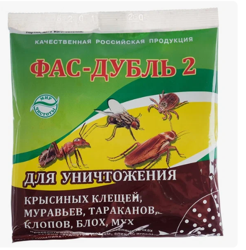 Инсектицидное средство Фас-дубль 2 представляет собой порошок от белого до серого цвета. Удобная упаковка (пакет-опыливатель) позволяет использовать препарат экономно и эффективно. Благодаря введению нового современного ДВ препарат дополнительно приобрел инсекто-акарицидные свойства: теперь активен не только против клопов, тараканов, муравьев, блох, мух, но и крысиных клещей - основных переносчиков вируса АЧС. Средство обладает острым инсектоакарицидным действием и остаточной активностью в течение 4-6 недель в отношении бытовых насекомых: