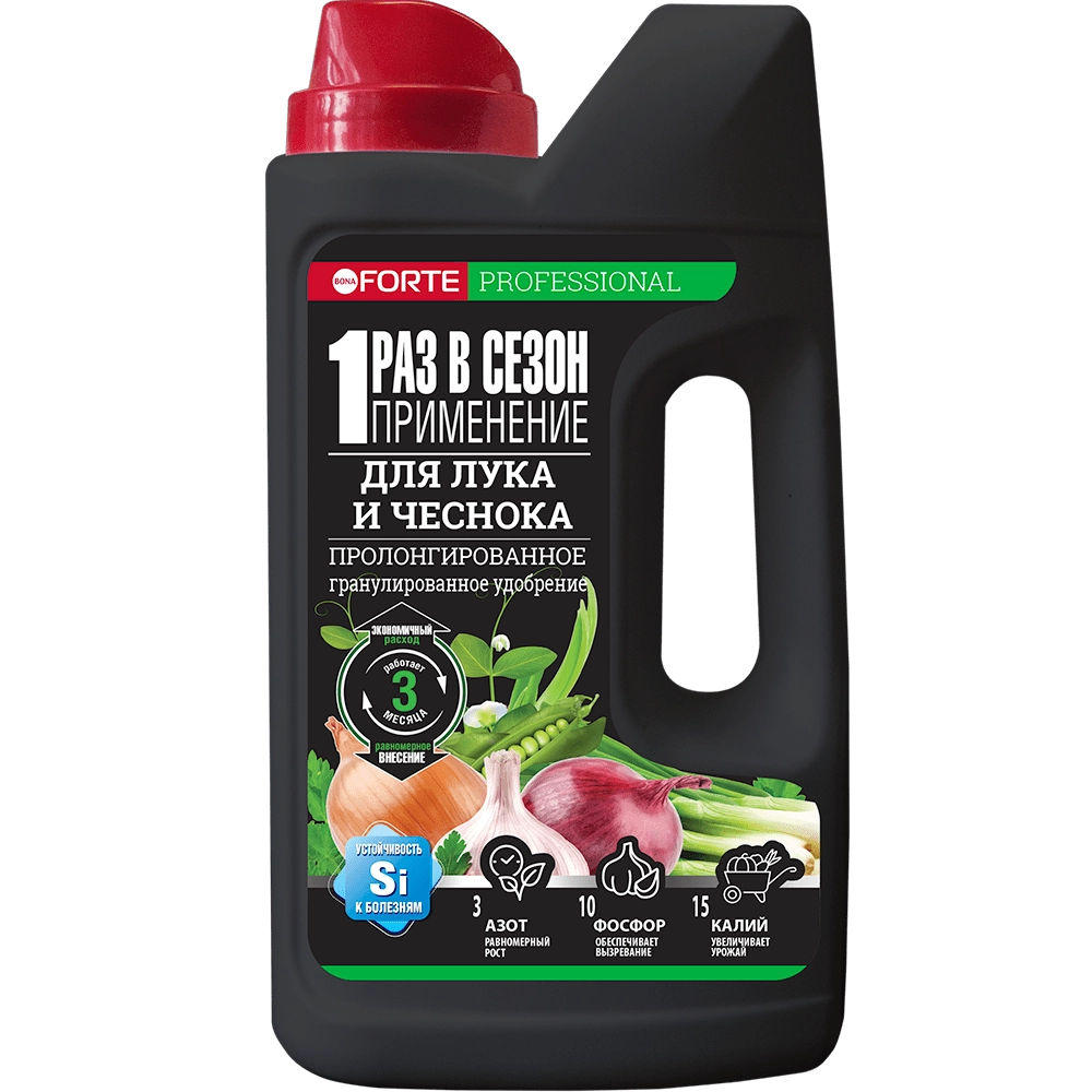 Удобрение сухое гранулир Bona Forte д/лука и чеснока пролонгированное с биодоступн кремнием 1л канистра шейкер (12)