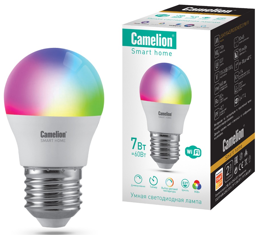 Умная лампа диодная шар G45 7Вт Е27 RGBСW WiFi Camelion (10/100)